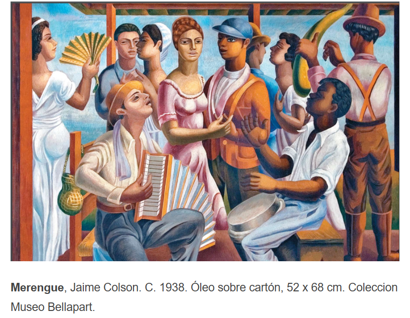 Jeanette Miller, al referirse a la obra Merengue, señala que se trata de una pintura realizada por Jaime Colson en 1938, en París, Francia, con óleo sobre lienzo, de 52 x 68 centímetros, y que forma parte de la colección del Museo Bellapart. Esta obra fue utilizada como sello postal conmemorativo en la República Dominicana.
